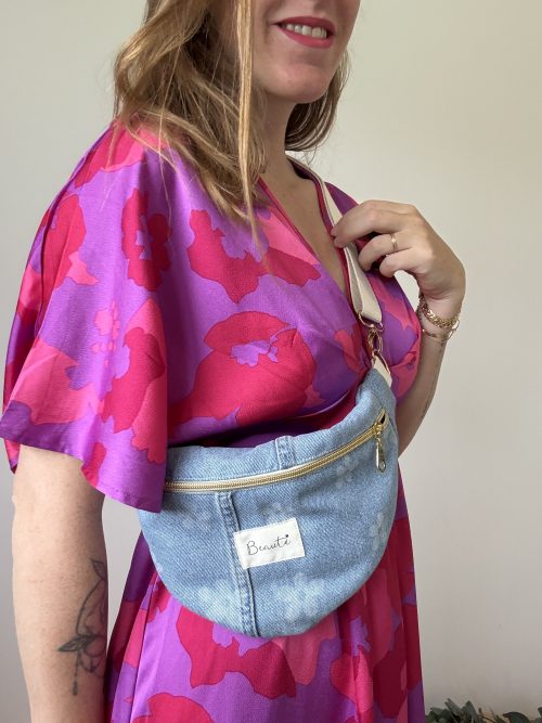 Un jean chiné, parfois oublié… que j’ai transformé en sac banane au caractère bien trempé.